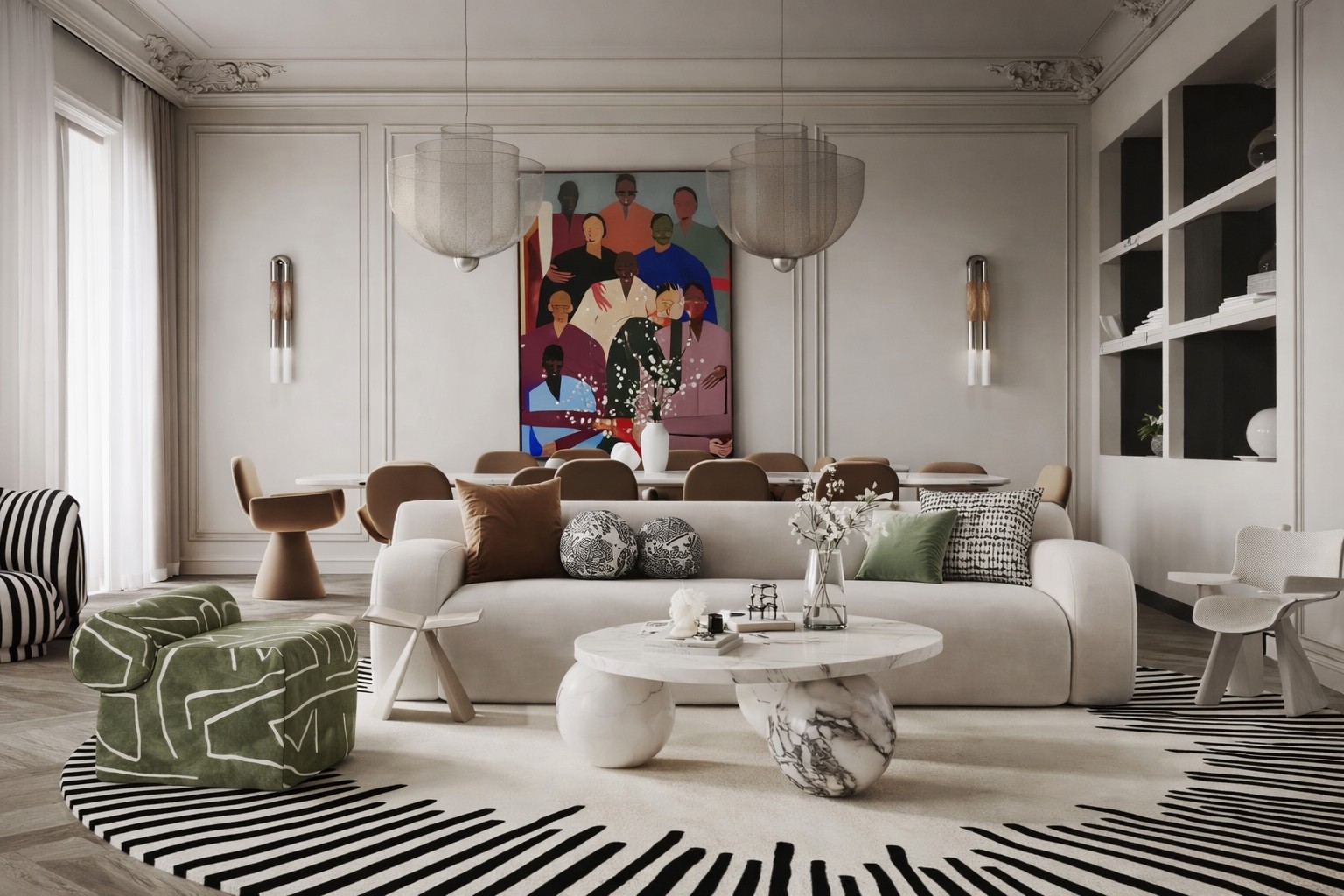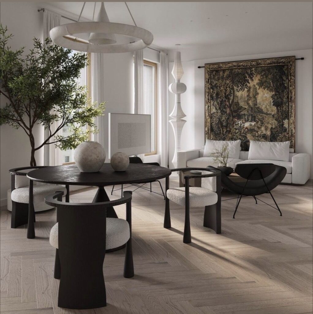 Modern maximalism has evolved far beyond layered patterns and saturated palettes. The new interpretation favors bold restraint—fewer objects, each with greater impact. Sculptural sofas, oversized lounge chairs, and expressive dining tables are paired with quieter architectural backdrops, allowing their forms to breathe.